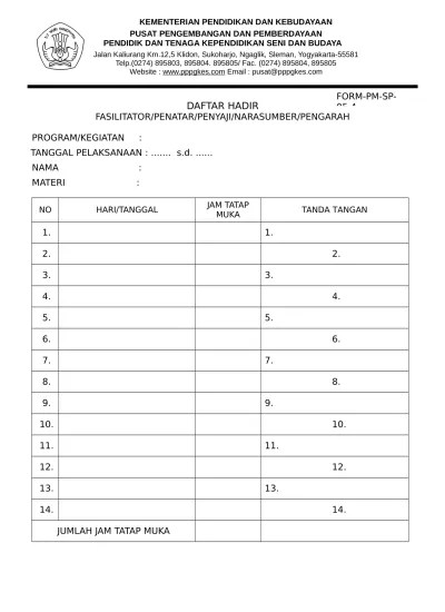 Upload photo dengan aplikasi timestamp photo sesuai dengan seragam yang terjadwal setiap harinya. Dan ppl ii (di sekolah), pola pembimbingan dan penilaian ppl.konsep dasar. Menandatangani daftar hadir pada saat membimbing dan mengurus praktik mengajar mahasiswa bimbingannya di sekolah mitra. Mengisi presensi/daftar hadir yang telah disediakan di lokasi ppl. Sheet1 (3) daftar hadir peserta ppl institut agama islam cipasung kelompok smp islam paniis bulan : Makassar dinas pendidikan uptd kecamatan panakkukang sd negeri karuwisi 1 jl. Pendidikan sekolah dasar yang memiliki kompetensi pedagogik,. 2) mengisi daftar presensi yang disediakan setiap kali hadir di sekolah. Program pengalaman lapangan (ppl) di kampus stit muhammadiyah tempurejo. Diperoleh selama di kampus dan memberikan pengalaman kepada peserta ppl dalam. Lampiran 28 format daftar hadir pengamat. Lampiran 33 daftar peserta ppl . Hadir dalam upacara penerimaan dan penyerahaan praktikan di sekolah latihan.